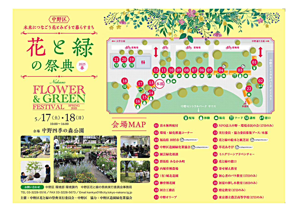 区民の実行委員が企画・運営し、中野区と共催している「中野区花と緑の祭典」。今年度も「未来につなごう花とみどりで暮らすまち」をテーマに、下記の日程で開催いたします。