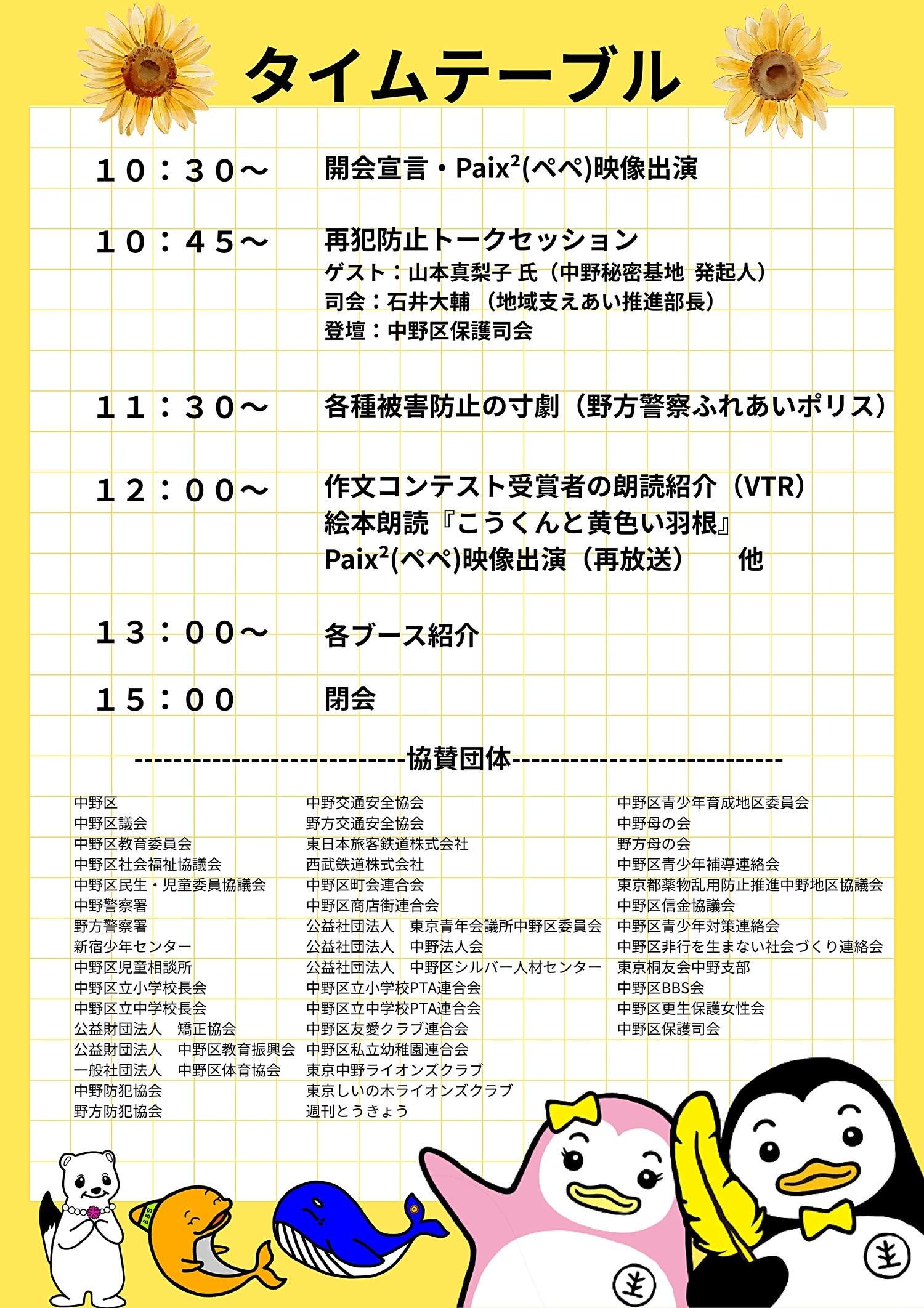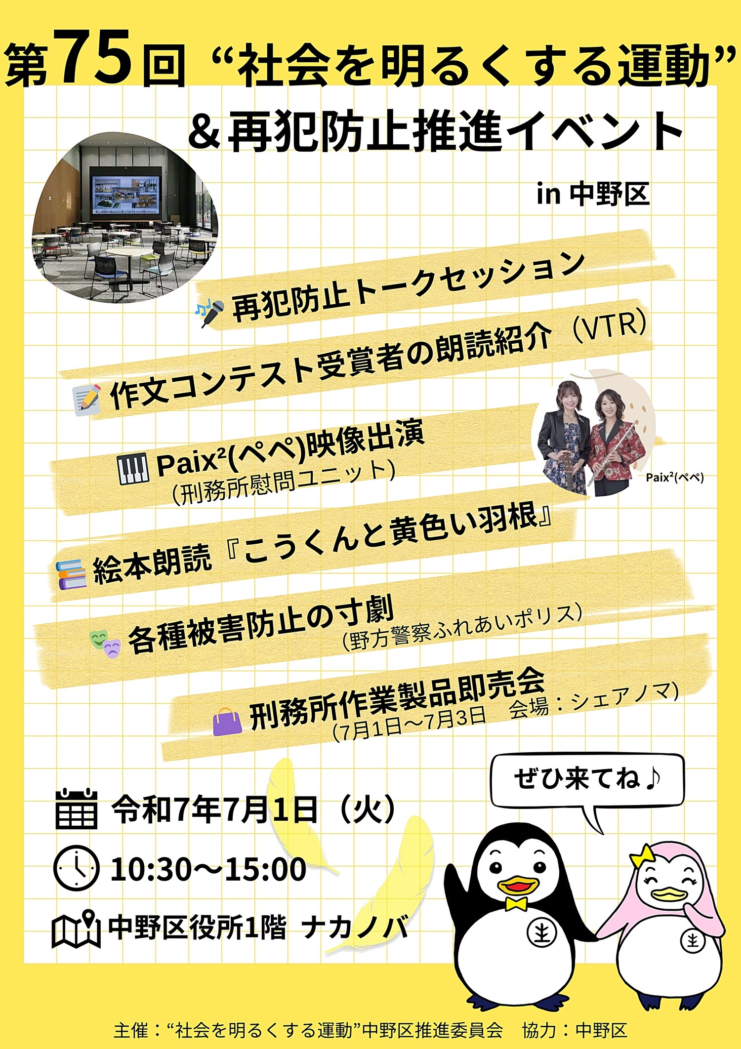 法務省:主唱"社会を明るくする運動"中野区推進委員会主催イベントです(協力:中野区)。7月協調月間の「キックオフイベント」として、中野区役所1階広場「ナカノバ」でいろいろな趣向で開催いたします。