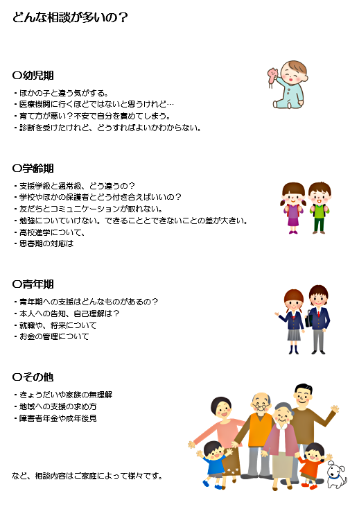 障がいがある子どもの親で、相談支援に関する一定のトレーニングを受け、悩みを持つ保護者の相談を聴き、自らの経験を活かして共感したり、地域の情報を提供します。