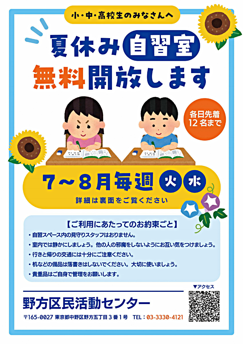 7~8月の2か月間、毎週火・水曜日に小・中・高校生のみなさんを対象に無料自習室として開放します!