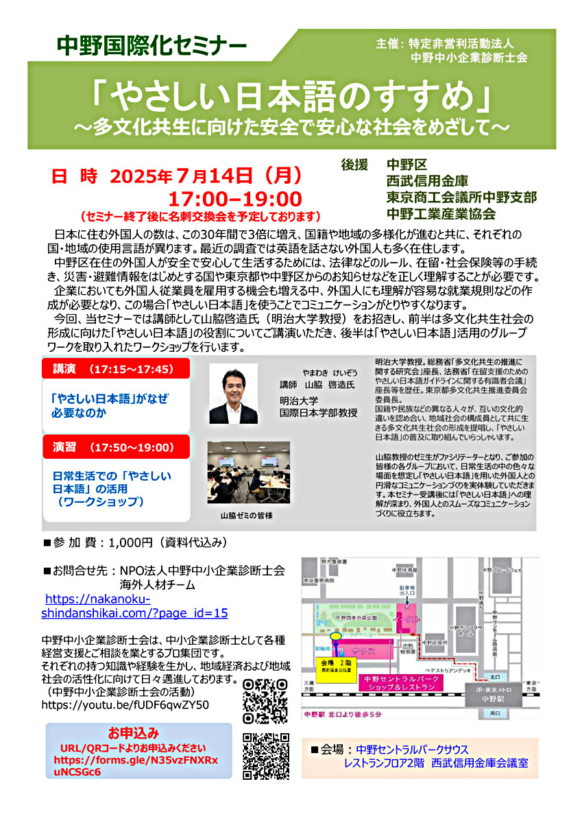 中野国際化セミナー「やさしい日本語のすすめ」~多文化共生に向けた安全で安心な社会をめざして~ - ためまっぷなかの