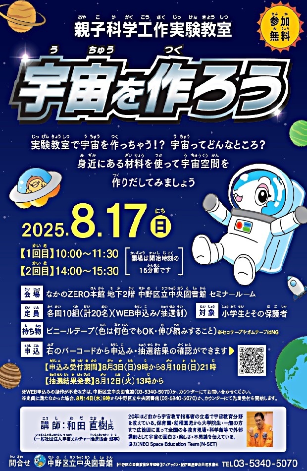 ※定員に満たなかった場合、8月14日(木曜日)9時から、中野区立中央図書館のお電話かカウンターにて先着受付を開始します。