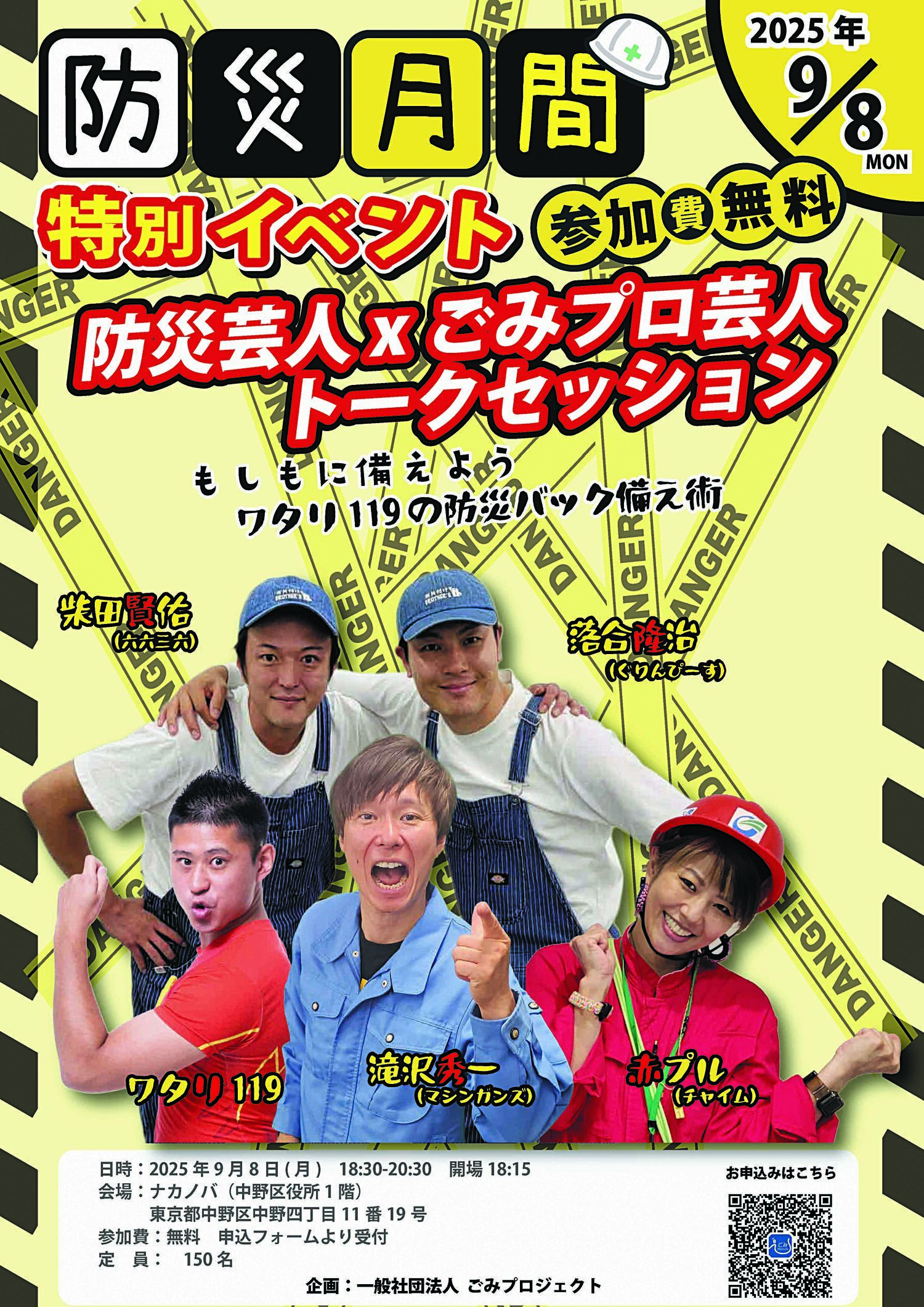 一般社団法人ごみプロジェクトがトークセッションのイベントを実施します。チラシのQRコードよりお申し込みください。 日時:9月8日(月)18時30分~ 会場:中野区役所1階「ナカノバ」