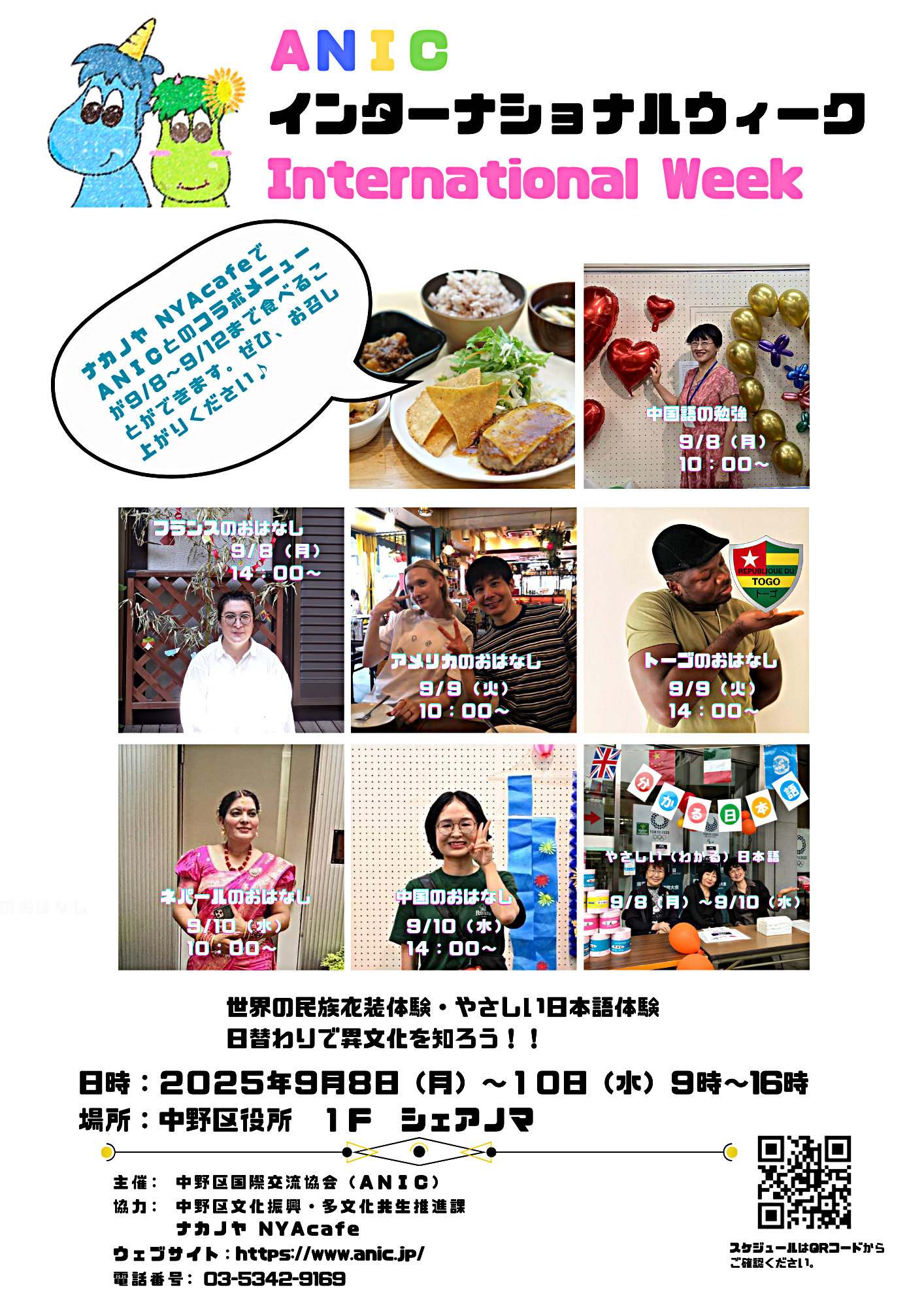 区役所1階シェアノマにて、中野区国際交流協会(ANIC)がインターナショナルウィークを開催します。