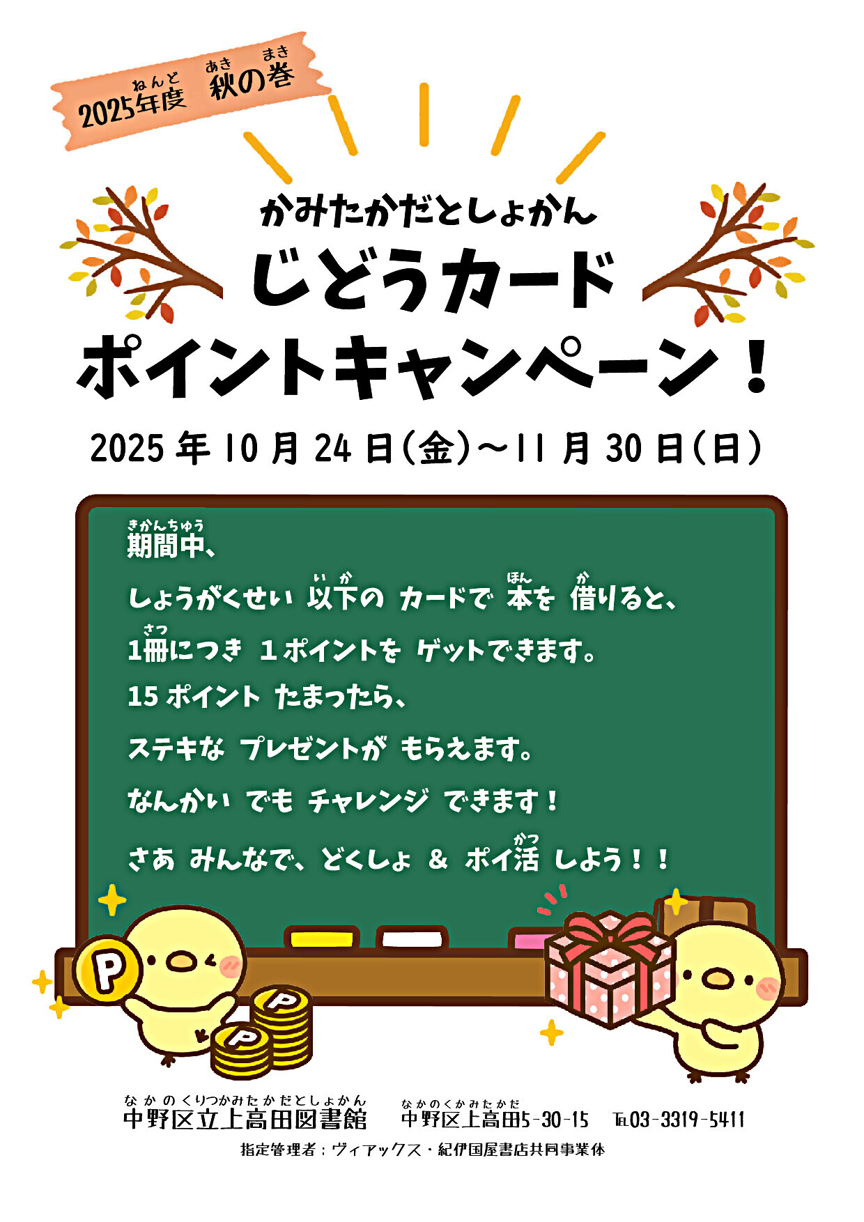 期間中、小学生以下のカードで本を借りると、1冊につき1ポイントをゲットできます。15ポイントたまったら、ステキなプレゼントが もらえます。