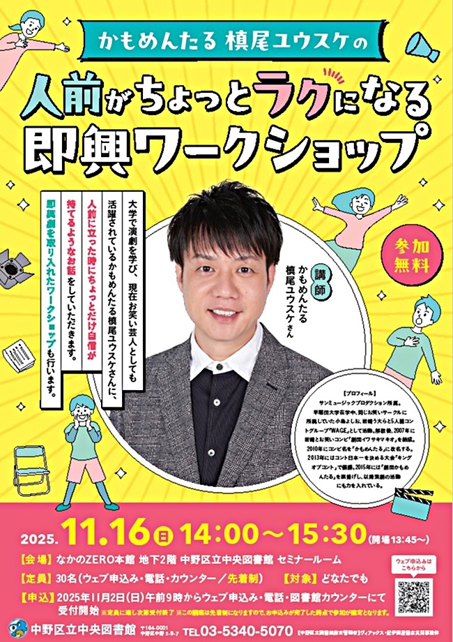 【イベント内容】大学で演劇を学び、現在お笑い芸人としても活躍されているかもめんたるの槙尾ユウスケさんに、人前に立った時にちょっとだけ自信が持てるようなお話をしていただきます。即興劇を取り入れたワークショップも行います。