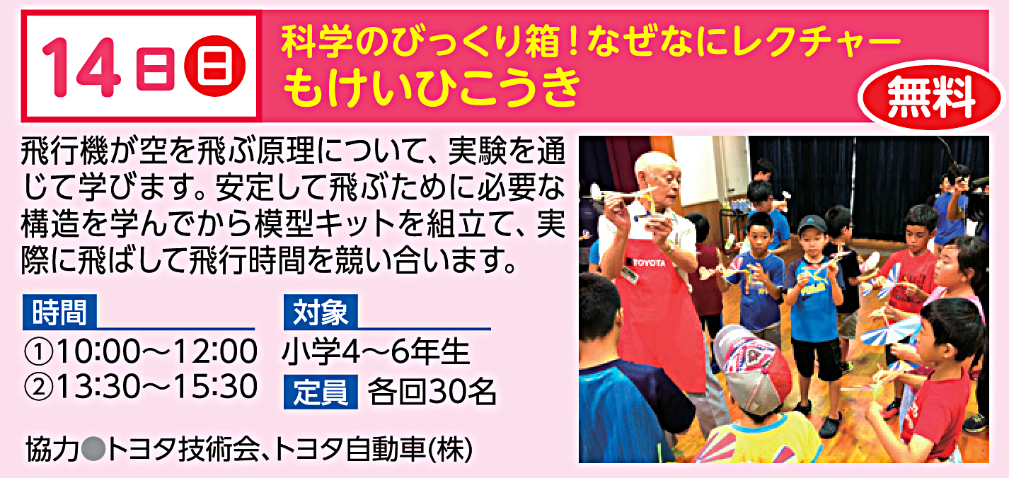 飛行機が空を飛ぶ原理について、実験を通して学びます。安定して飛ぶために必要な構造を学んでから模型キットを組立て、実際に飛ばして飛行時間を競い合います。