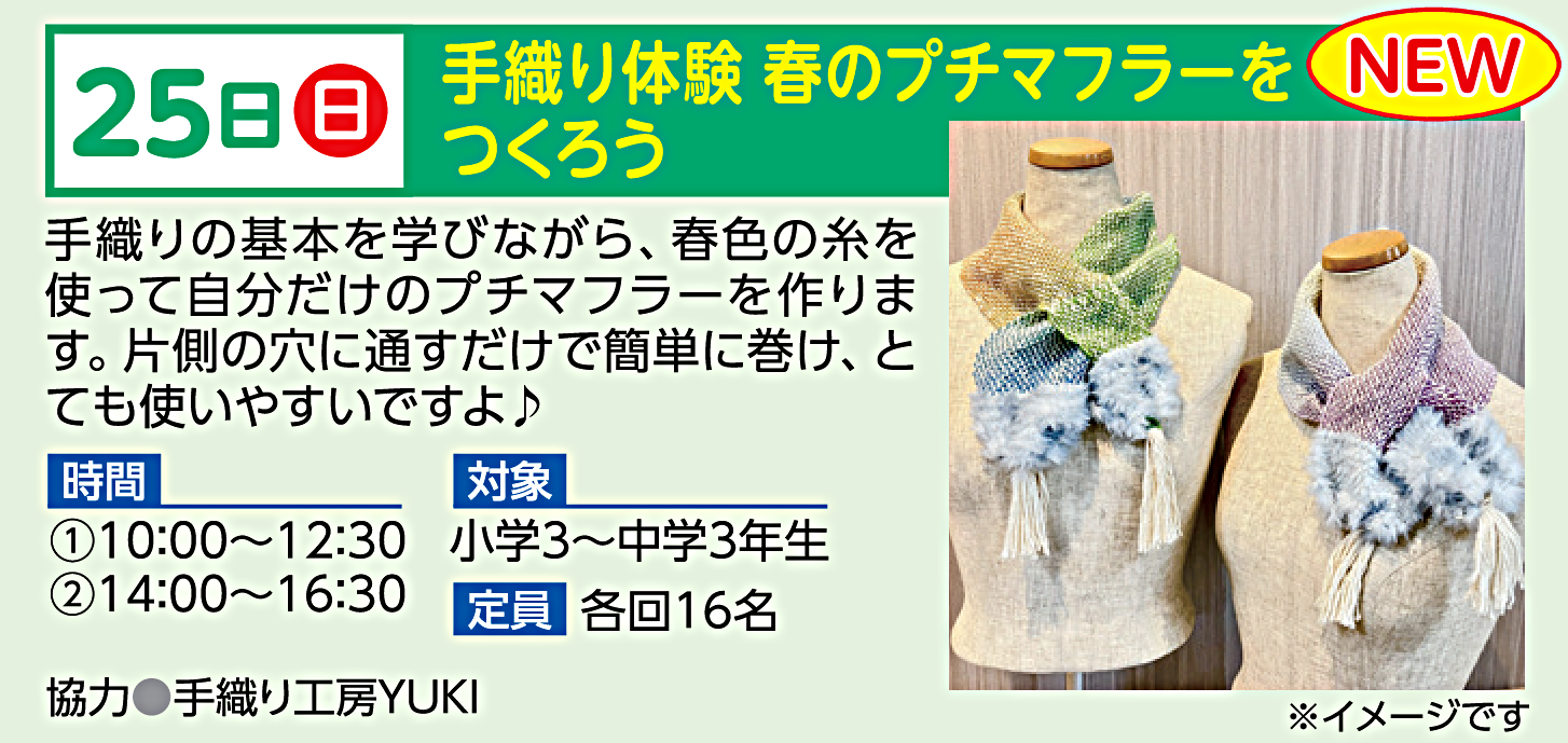手織りの基本を学びながら、春色の糸を使って自分だけのプチマフラーを作ります。片側の穴に通すだけで簡単に巻け、とても使いやすいですよ♪