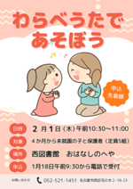 【時間】午前10時30分~11時【対象】4カ月から未就園児の子と保護者(定員5組)【申込】1月18日午前9時半から電話受付