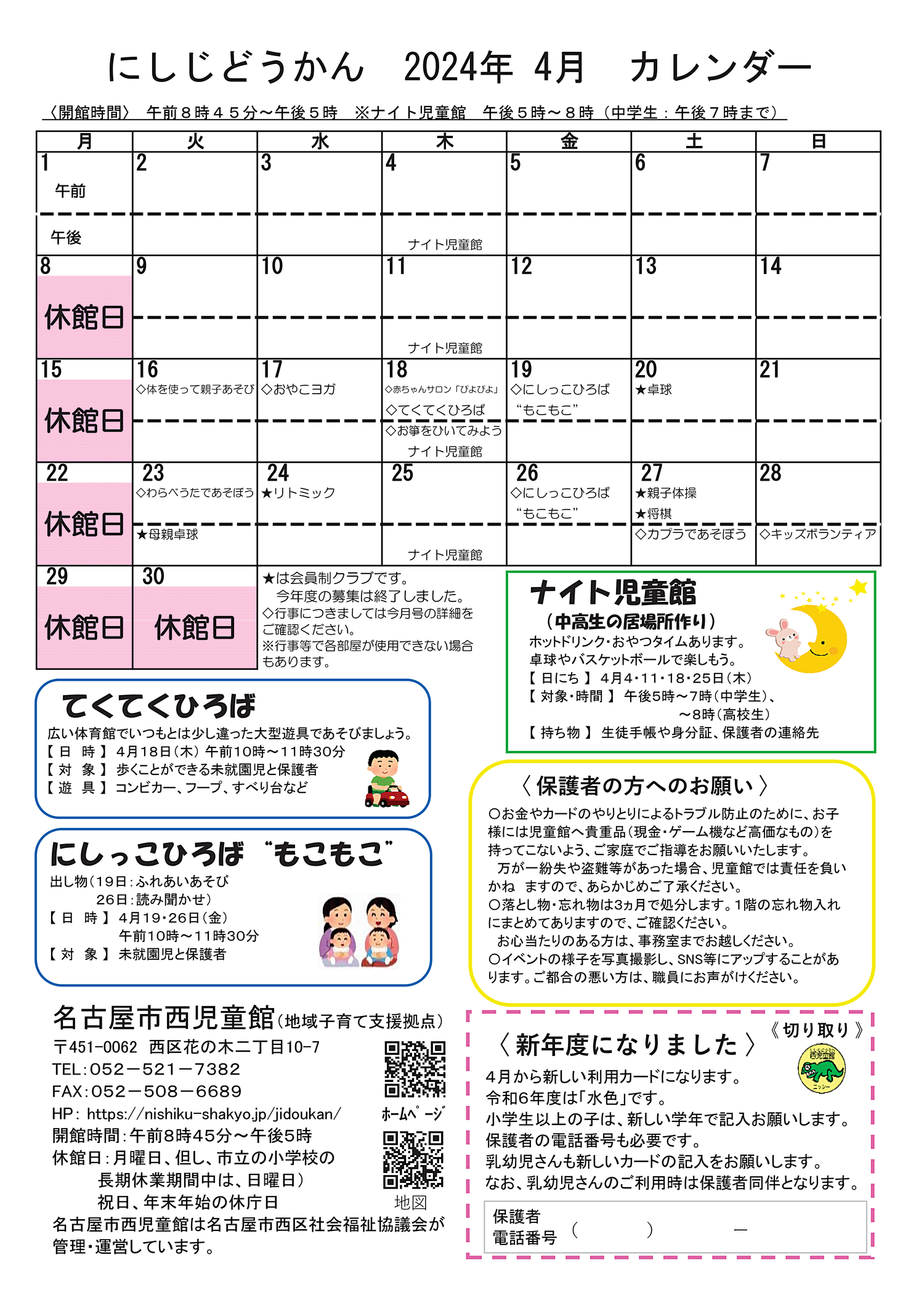 【申込】4月4日午前10時から児童館窓口にて受付 10時30分からは電話申込も可
