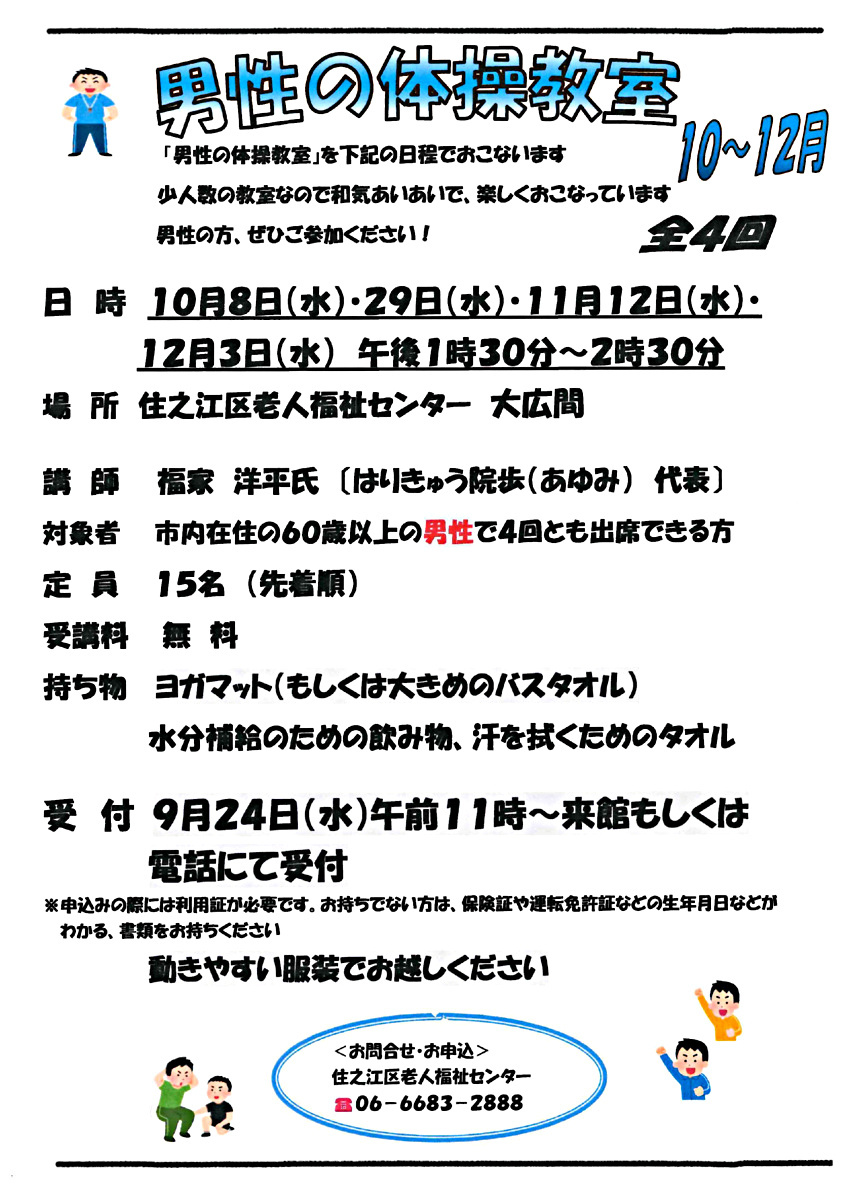 「男性の体操教室」を10月~12月でおこないます。少人数の教室なので和気あいあいで、楽しく運動できますよ♪男性の方、ぜひご参加ください!
