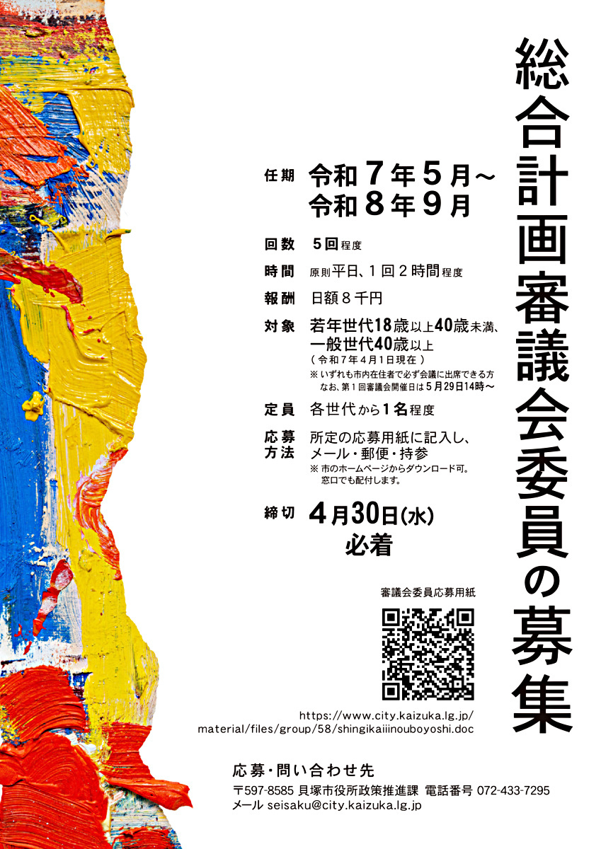 応募用紙はこちらからhttps://www.city.kaizuka.lg.jp/material/files/group/58/shingikaiiinouboyoshi.doc
