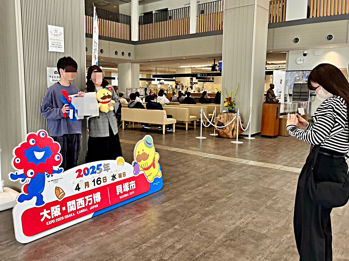 大阪・関西万博の公式キャラクター「ミャクミャク」と、貝塚市のイメージキャラクター「つげさん」と一緒に写真を撮ることができる『フォトスポット』を、貝塚市に本社のある日本紙工株式会社に作成していただき、貝塚市役所1階ロビーに設置しました。