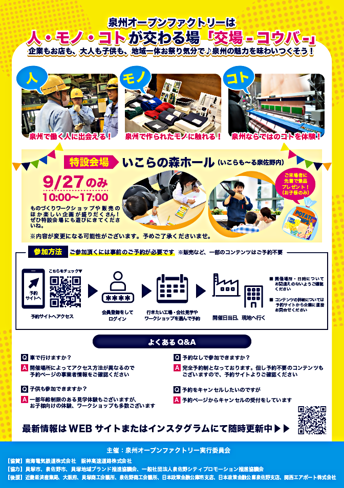 また9月27日(土)はサテライト会場として、いこらも〜る泉佐野2階・いこらの森ホールにて参加事業者による体験、ワークショップ、展示販売等が予定されています。
