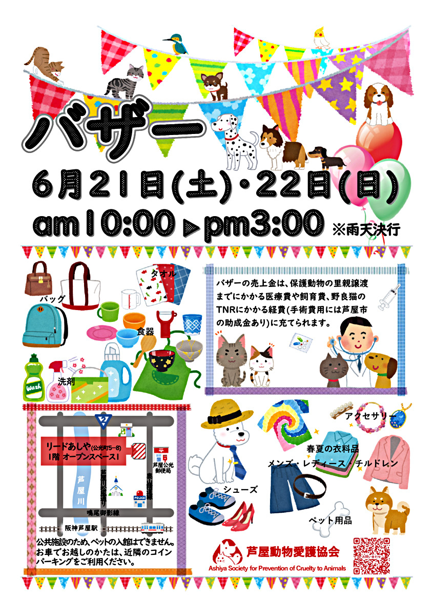 バザーの売上金は、保護動物の里親譲渡までにかかる医療費や飼育費、野良猫のTNRにかかる経費(手術費用には芦屋市の助成金あり)に充てられます。