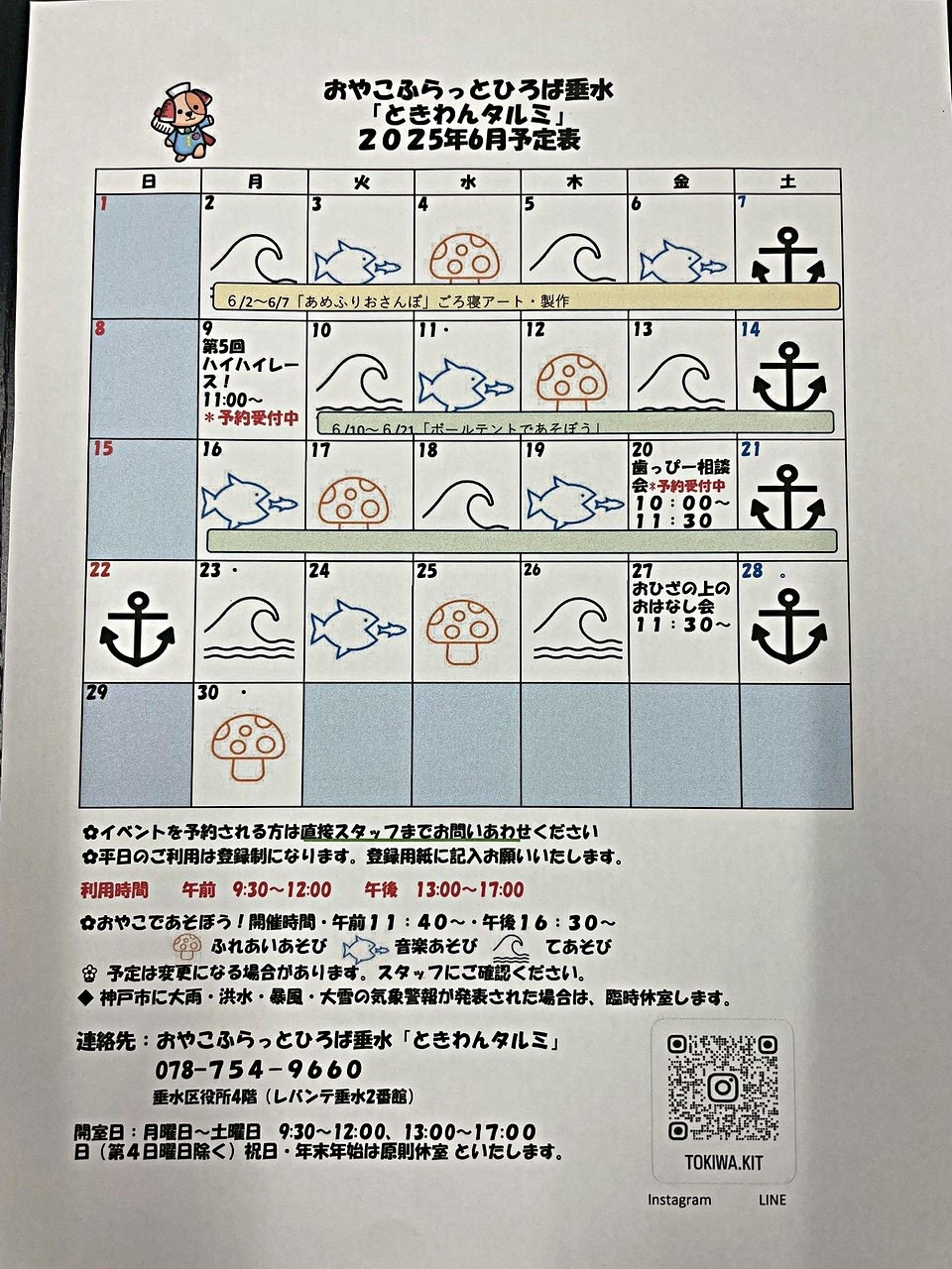 おやこふらっとひろば垂水(ときわんタルミ)6月のカレンダーです