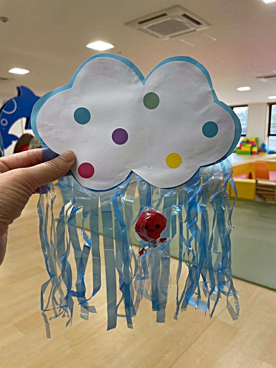 もくもく雲にシールを貼ったり、てるてる坊主に顔を描いてみましょう☂️