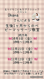 ご予約が満員の場合は当院のHPの予約サイトでは予約が取れなくなっています。キャンセル待ちをされる場合は講師の方のインスタグラムにDMをお願いしますhttps://www.instagram.com/ohana_babyma_hikari?igsh=anVsN3k1M3ByZmZi
