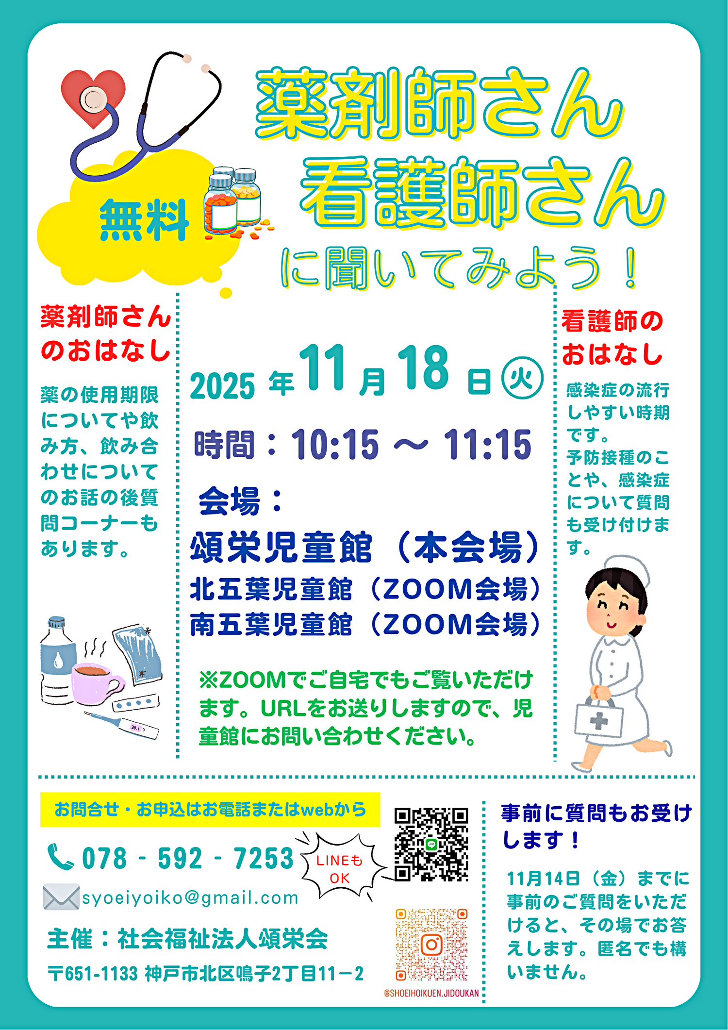 子育てしている中で、病気や予防接種、お薬や健康に関して普段何となく気になっていることや疑問に思っていることを専門の薬剤師さんや看護師さんに聞いてみませんか?事前に質問も募集しています。個別で相談もできます。zoomでもご覧いただけますので是非ご参加下さい。