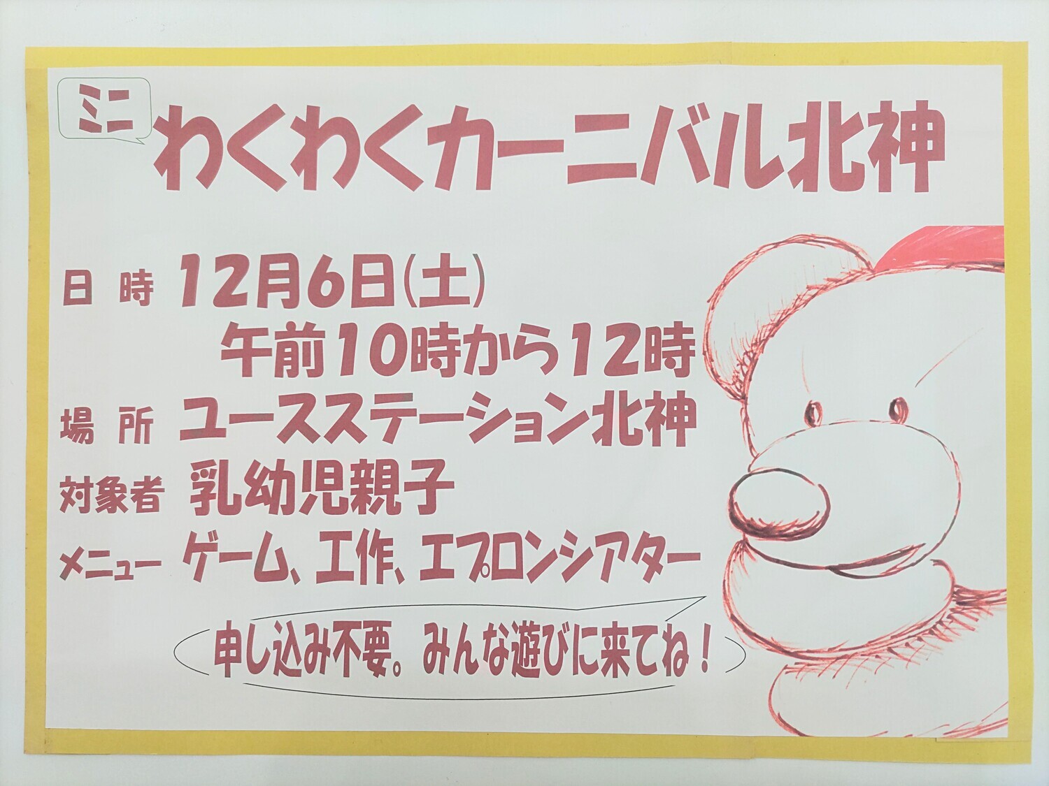 ミニわくわくカーニバルを開催いたします。輪投げや魚釣り、わにわにパニック等を楽しんで頂いたり、ミニ工作やエプロンシアターも開催致します。ぜひ遊びに来て下さいね♪