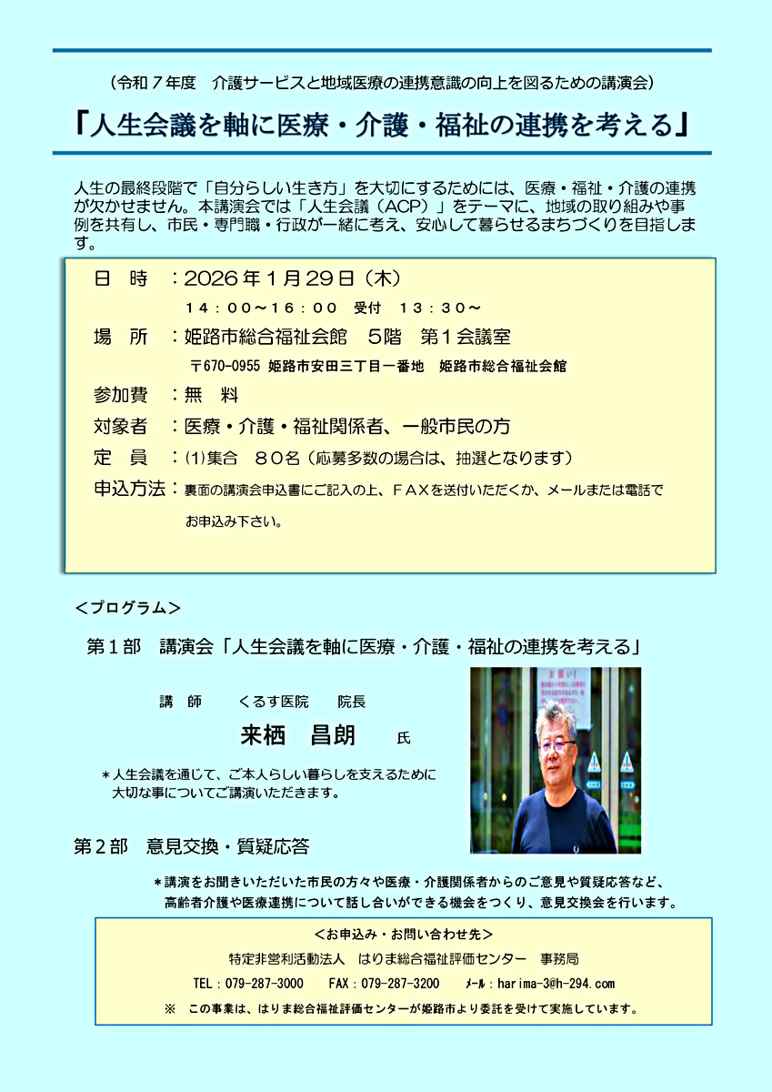 本講演会では「人生会議(ACP)」をテーマに、地域の取り組みや事例を共有し、市民・専門職・行政が一緒に考え、安心して暮らせるまちづくりを目指します。