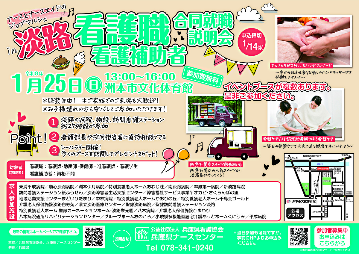 看護職・看護補助者のための合同企業説明会が洲本市文化体育館にて開催されます。