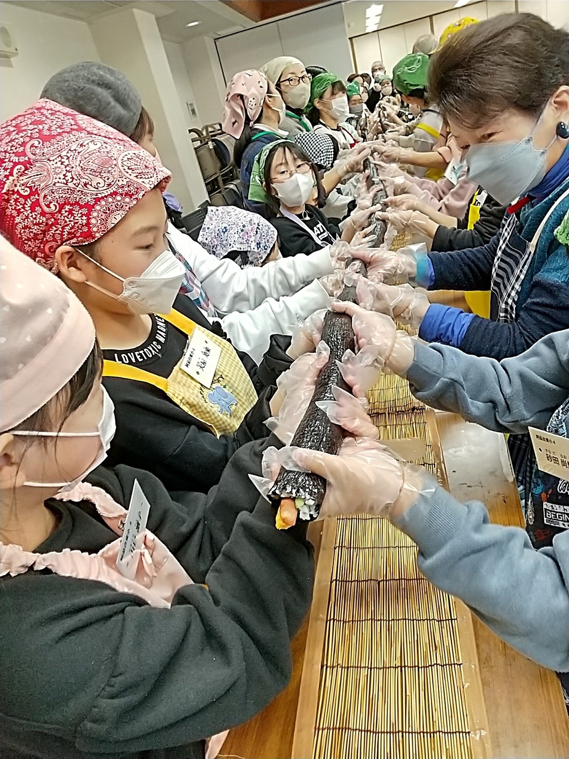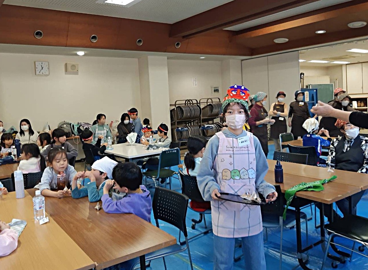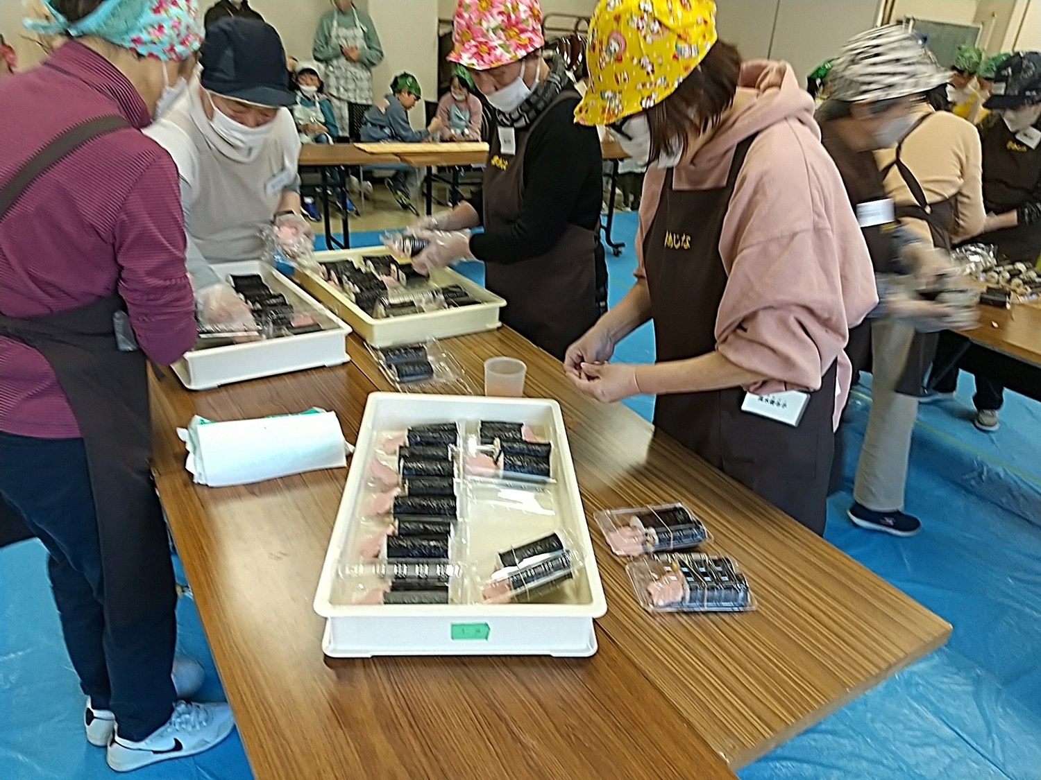製作した巻き寿司を一同で試食した後、ぜんざい、豆まき、ゲ-ムなどで楽しみ解散しました。