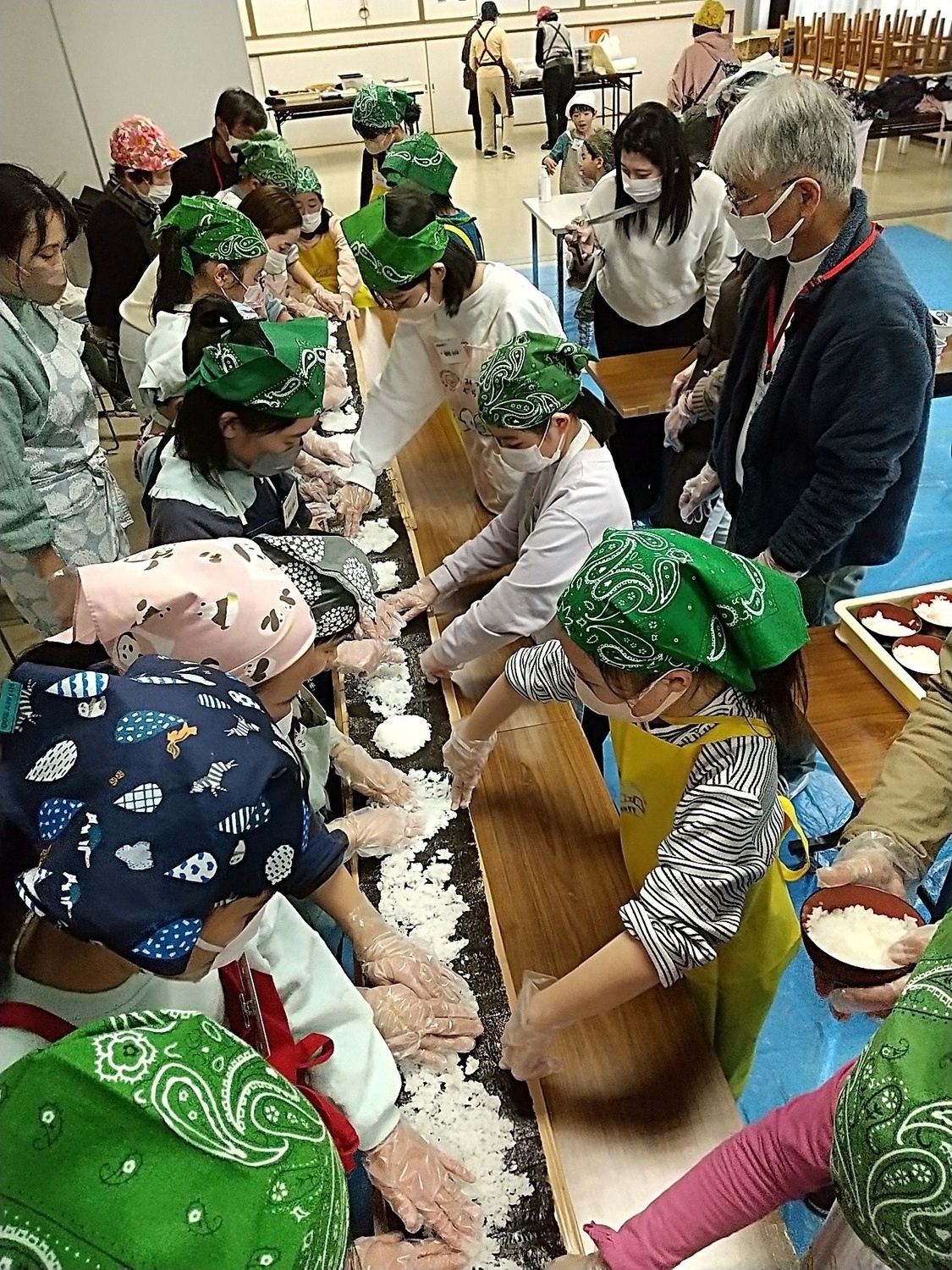今回は廿日市市大野東小と阿品台中中学校区の小学生とのコラボで阿品台市民センタ-で超長巻き寿司(7m強)x2本の製作に挑戦しました。