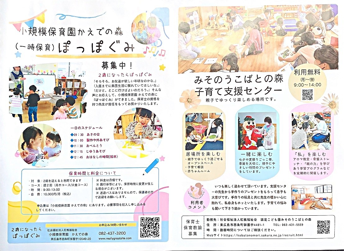 詳細については、「みそのうこばとの森 子育て支援センター」でお問い合わせ下さい。