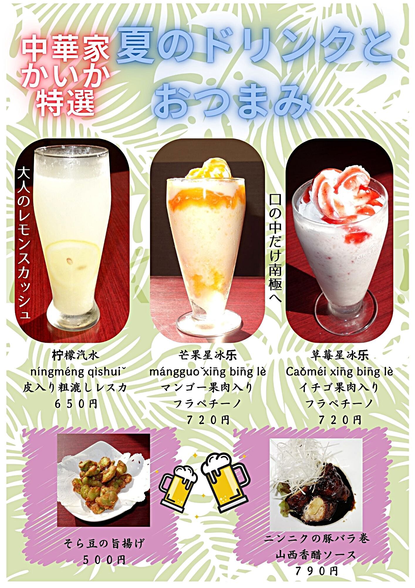 例年大好評の自家製冷やし中華2選と大人のレモンスカッシュやフラペチーノなど夏に嬉しいものがいっぱいです。