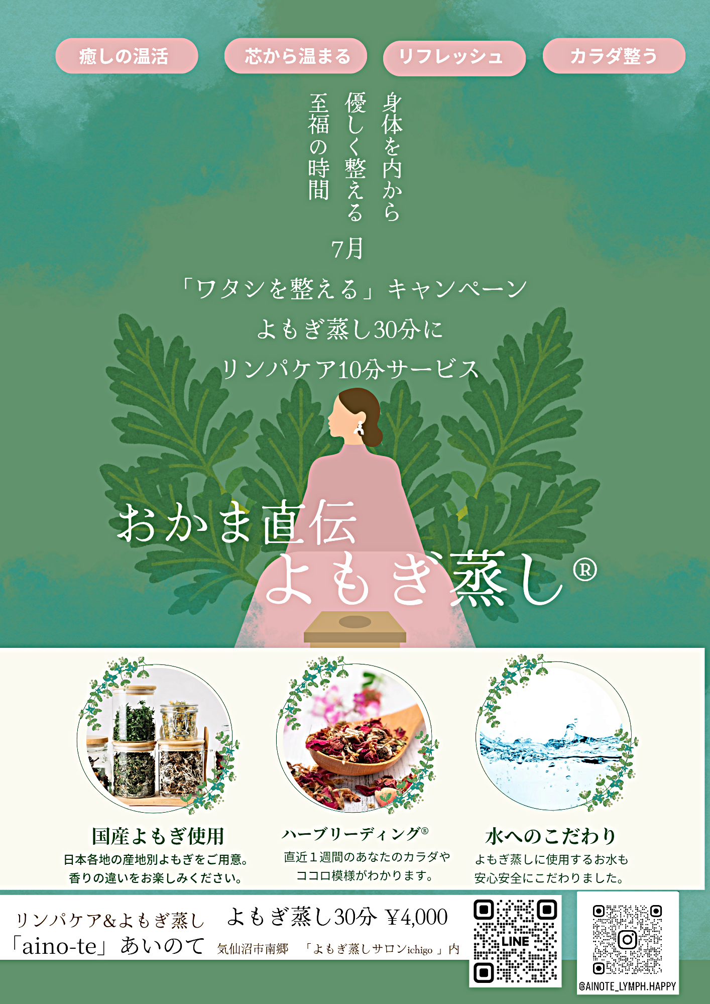 #気仙沼サロン#よもぎ蒸し#気仙沼よもぎ蒸し#おかま直伝よもぎ蒸し®#リンパケア#愛式メディカルリンパ® #リンパケアサロン #気仙沼リンパ#ainote#あいのて#宮城県#登米市#陸前高田市