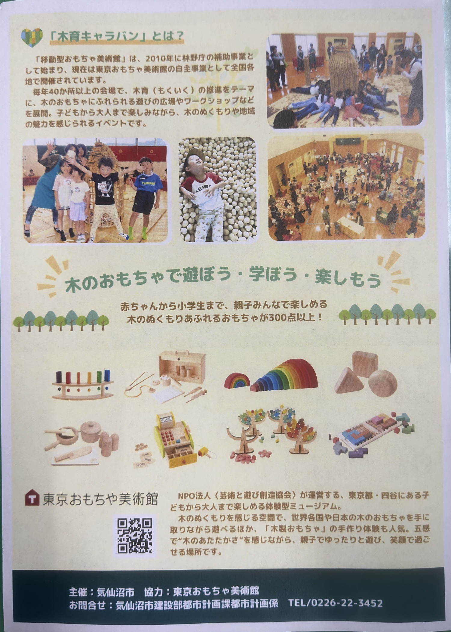 「木育キャラバン」は「移動型おもちゃ美術館」として、2010年に林野庁の補助事業として始まり、現在は東京おもちゃ美術館の自主事業として全国各地で開催されているイベントです。