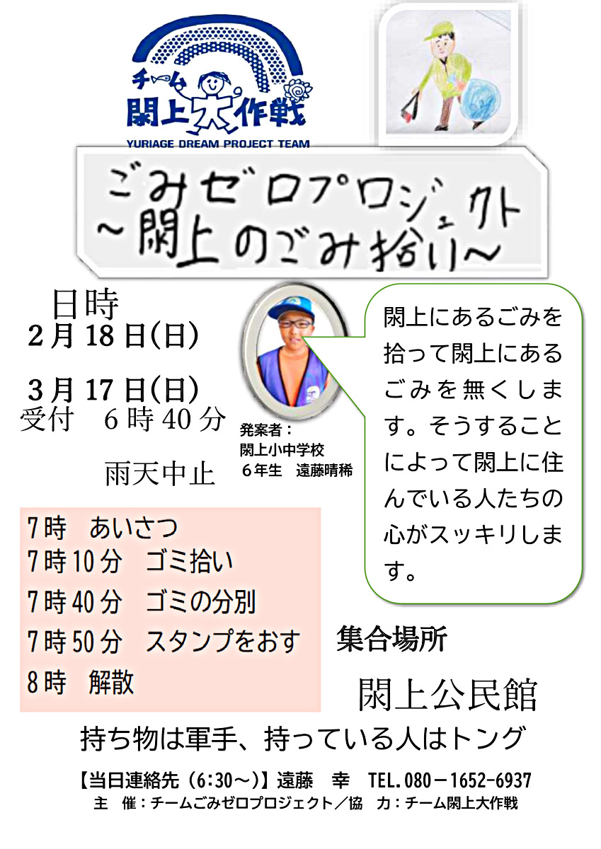 閖上のゴミを拾ってゼロにします。住む人の心がスッキリするので、ぜひ参加してください。(by企画発案者・閖上小中学校6年生Hくん)