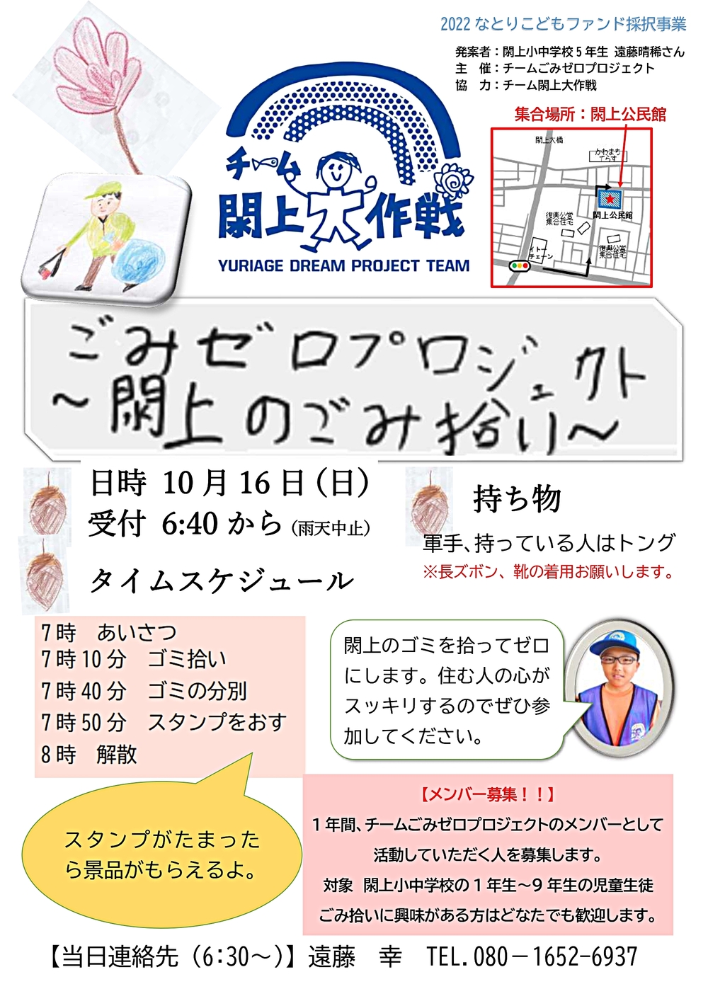 閖上のゴミを拾ってゼロにします。住む人の心がスッキリするので、ぜひ参加してください。(by企画発案者・閖上小中学校5年生Hくん)