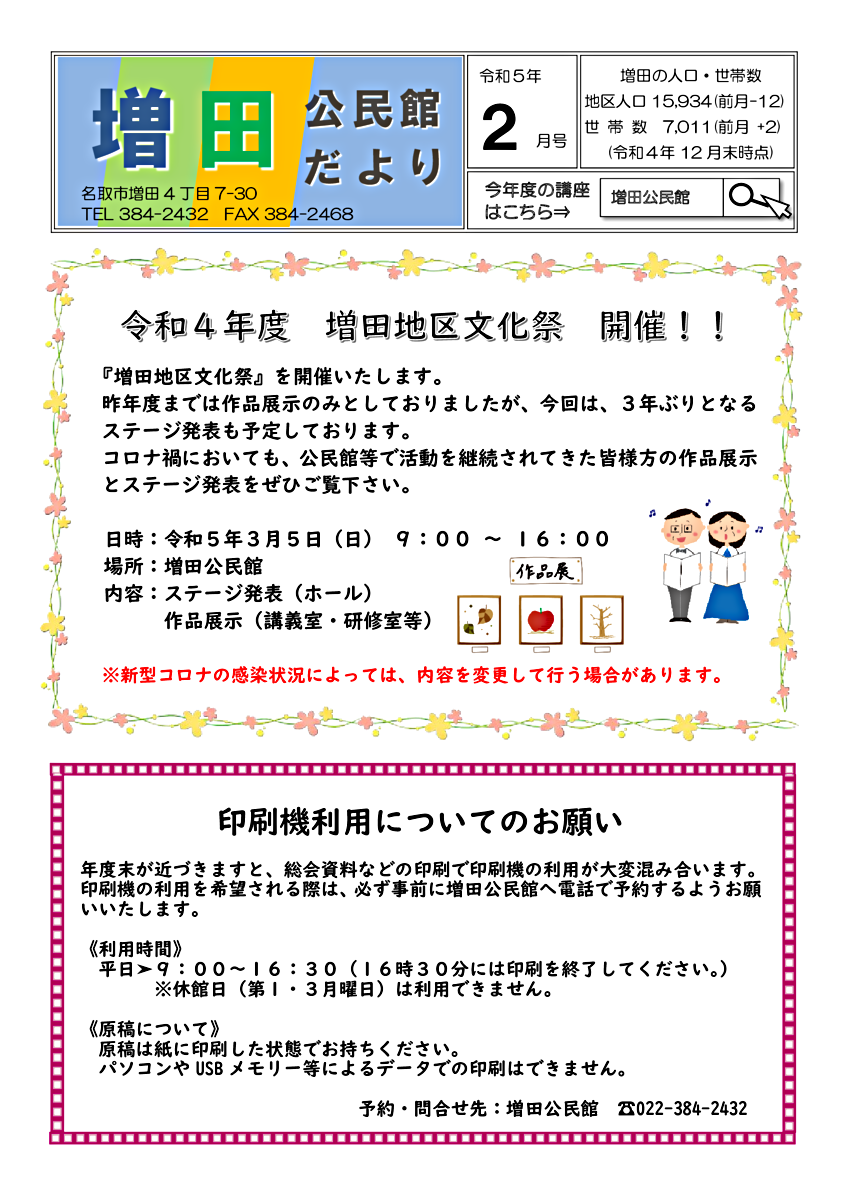 ★毎月1日・15日・末日にその月の公民館だよりを掲載しています。★内容に関するお問い合わせは各公民館までお願いします。