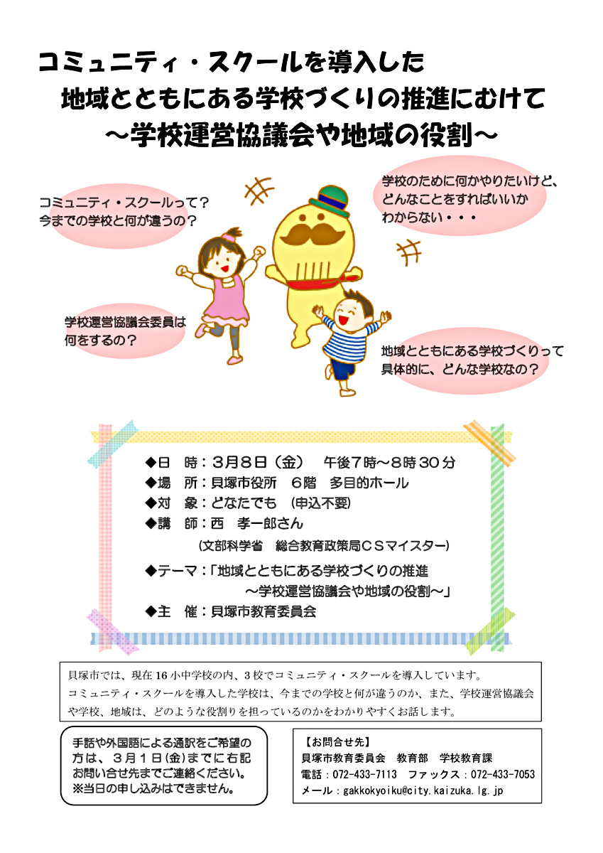 手話や外国語による通訳をご希望の方は、3月1日(金)までに、貝塚市教育委員会 学校教育課までご連絡ください。