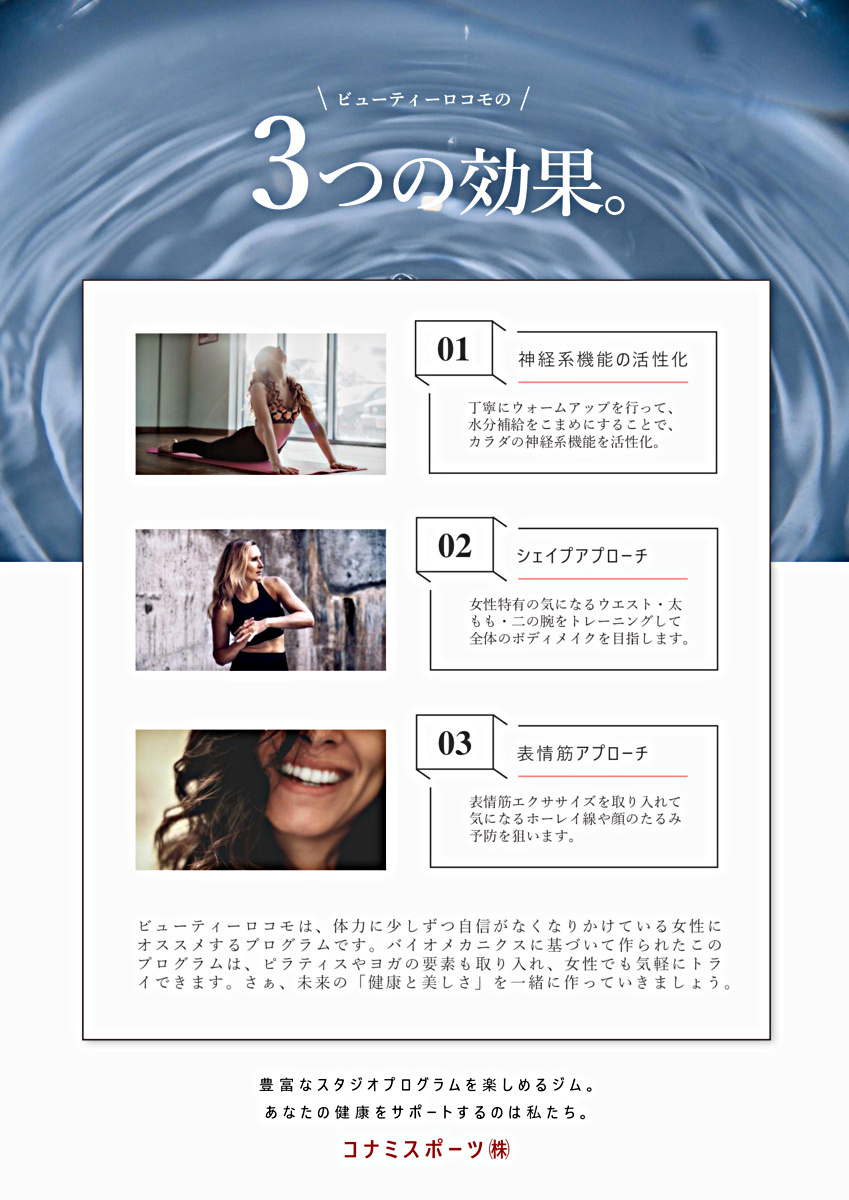 いつまでも美しく輝き続けたい女性の、体づくりをサポートするプログラムです。初めての方でも簡単にご参加いただける内容です。まずは体験をしてみませんか? お気軽に施設までお問い合わせください。