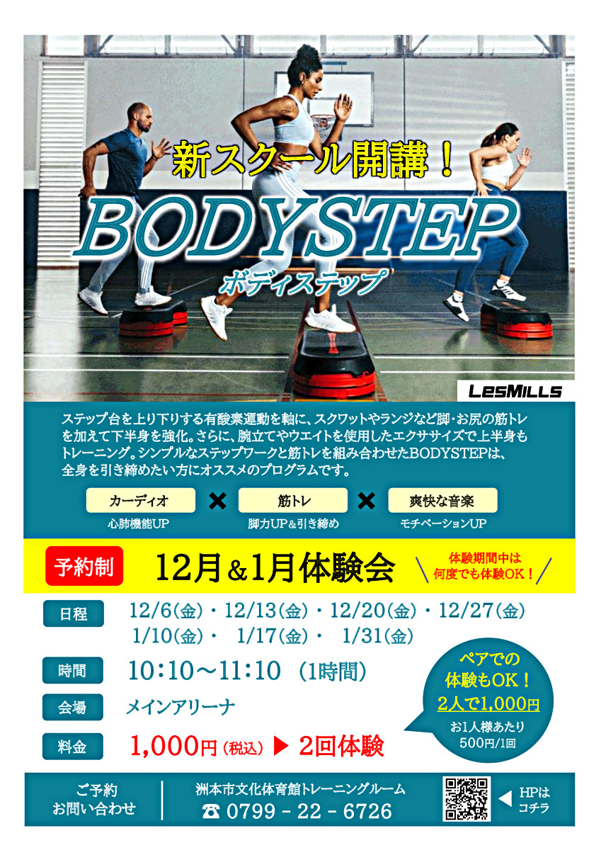 大人向けのスクール『ボディステップ』を新たに開講致します ! 世界のフィットネスを常に牽引するレズミルズプログラムより、脚とお尻を引き締め、女性に人気のプログラム『ボディステップ』を洲本市文化体育館で導入します。ステップ台を上り下りする事で心肺機能を高める持久力トレーニングと、スクワットやランジなど下半身を引き締めるためのトレーニングが融合した、究極のステッププログラムです。12・1月はご予約をいただいた方のみ参加いただける体験会を実施します。この期間に限り 1,000円(税込)で2回体験する事が可能です。※ 1回あたり500円(税込)