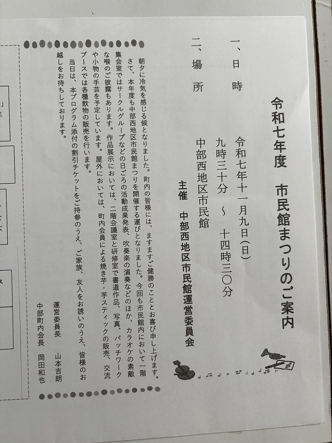 中部西市民館のサ-クル活動G、豊川少年少女合唱団、小坂井高校吹奏楽などの演技披露。習字、手芸、写真など展示。地域性たっぷりで、すごく楽しいイベントです♪どなたでも、観覧大歓迎です♪